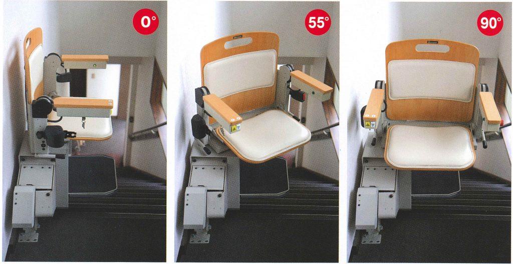 海外メーカーの1本レールの昇降機では、イスの角度を変えて昇降する機能も