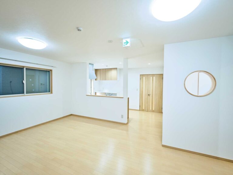 玄関入ってすぐの広いリビングです。丸い窓がある右側が職員室、左側がキッチンとなっています。大人も子供もコミュニケーションを取りやすい位置に配置しました。
