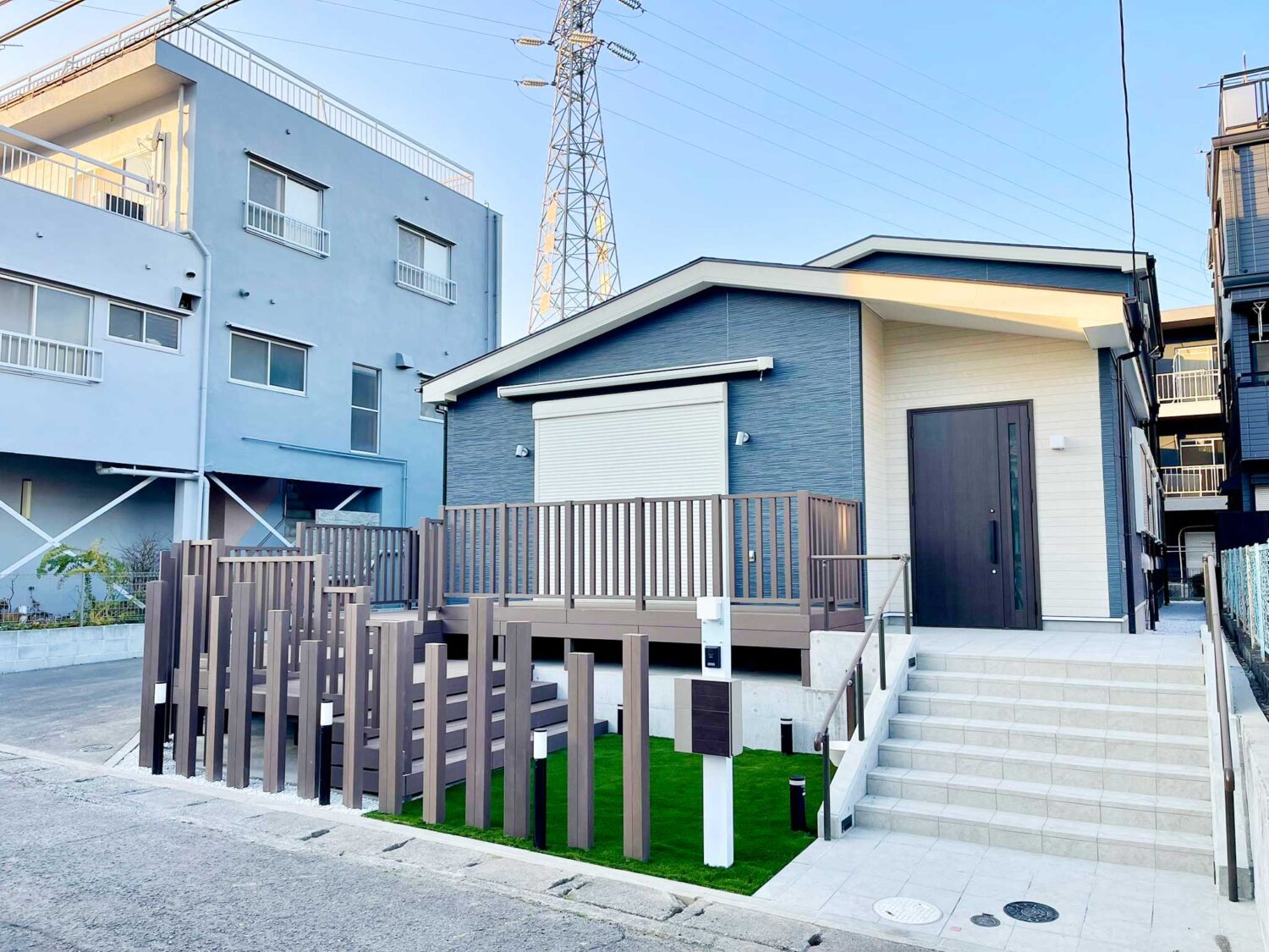 土地にもとからあった段差を利用して作ったウッドデッキと人工芝の庭です。段差のある場所に座っておやつを食べたり、イベントをしてみたり使い方は発送次第でいろいろあります。