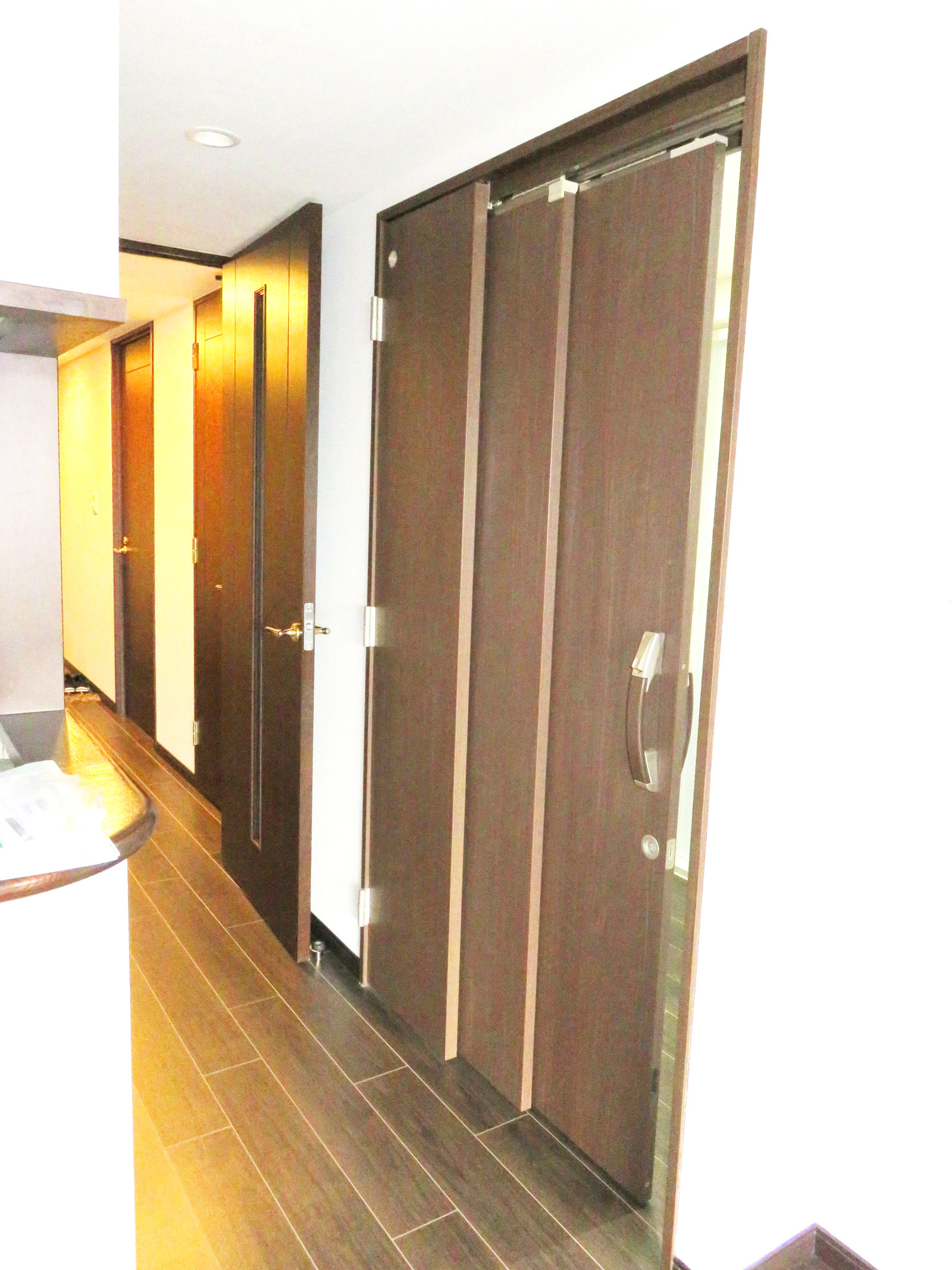 この問題を解決するために、開口幅を広く確保できる、大建工業の「ひきドア」を採用し、出入りのしやすさが格段に向上しました。